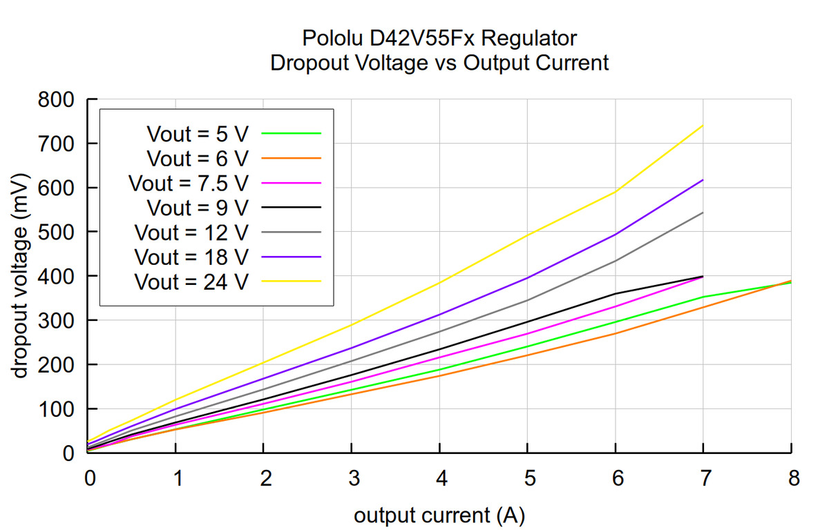 The dropout voltage of a step-down regulator is the minimum amount by which the input voltage must exceed the regulator’s target output voltage in order to ensure the target output can be achieved. For example, if a 5 V regulator has a 1 V dropout voltage, the input must be at least 6 V to ensure the output is the full 5 V. Generally speaking, the dropout voltage increases as the output current increases. The two graphs below shows the dropout voltages for this family (the 3.3 V version has its own separate graph because its dropout voltage curve is very different from the other members of this family):