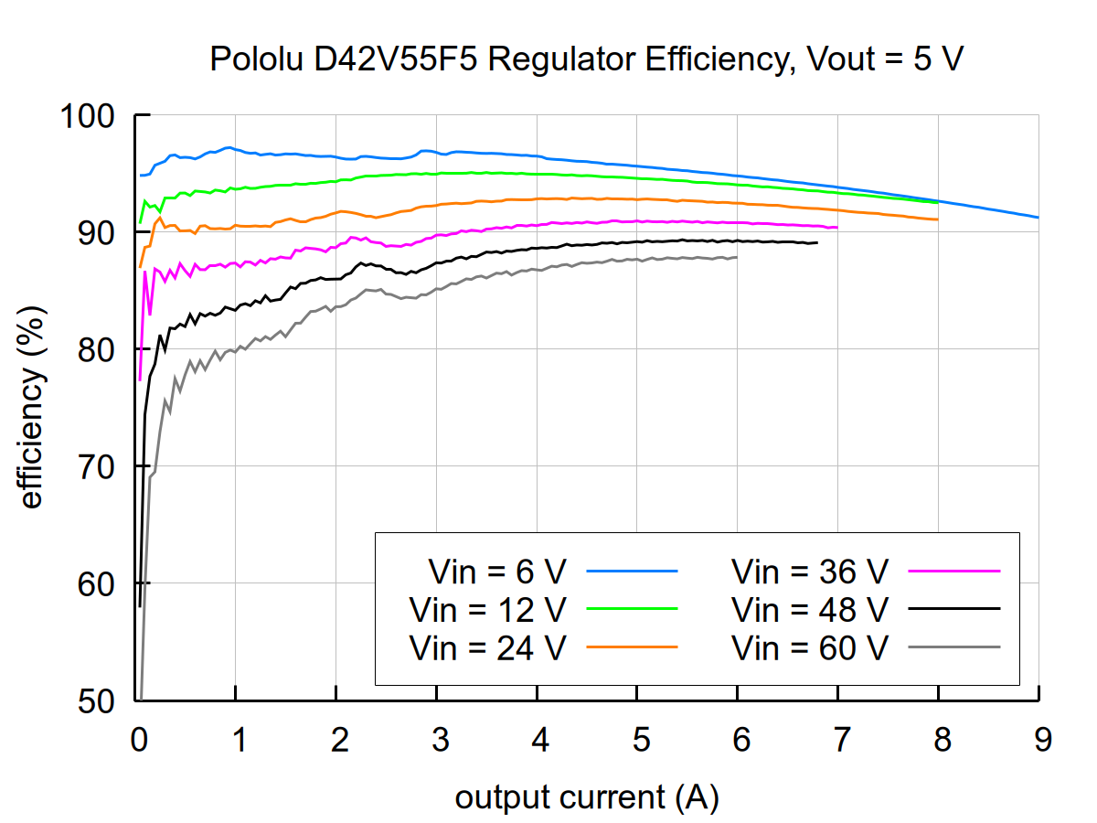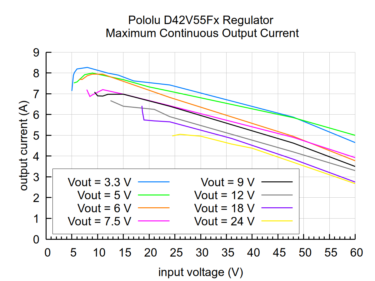 The D42V55Fx family of synchronous buck (step-down) voltage regulators generates lower output voltages from input voltages as high as 60 V. They are switching regulators (also called switched-mode power supplies (SMPS) or DC-to-DC converters), which makes them much more efficient than linear voltage regulators, especially when the difference between the input and output voltage is large. These regulators can typically support continuous output currents between 3 A and 8 A, depending on the input voltage and output voltage (see the Maximum continuous output current section below). In general, the available output current is higher for the lower-voltage versions than it is for the higher-voltage versions, and it decreases as the input voltage increases.