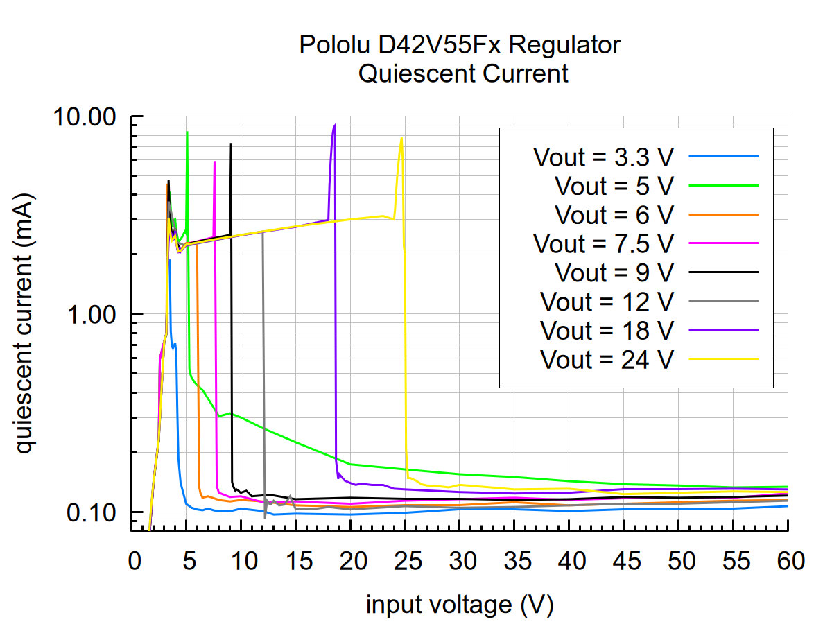 The quiescent current is the current the regulator uses just to power itself, and the graph below shows this for the different regulator versions as a function of the input voltage. The module’s EN input can be driven low to put the board into a low-power state where it draws approximately 50 µA plus 1 µA per volt on VIN (note that for high input voltages, this current draw can exceed the quiescent current draw of the regulator).