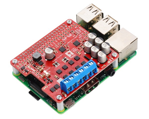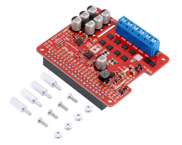 This add-on board makes it easy to control two high-power DC motors with a Raspberry Pi. Its twin discrete MOSFET H-bridges support a wide 6.5 V to 30 V operating range and are efficient enough to deliver a continuous 18 A without a heat sink. The drivers offer basic current limiting functionality, and they accept ultrasonic PWM frequencies for quieter operation. The default pin mappings make it easy to get started, but they can be customized for more specialized applications. This version ships fully assembled with connectors soldered in.