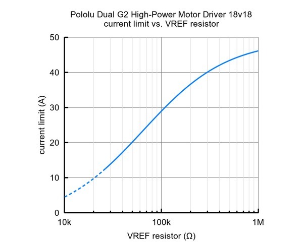 On this board (18v18), the nominal current limiting threshold is set to about 50 A by default. For each motor channel, you can lower the limit by connecting an additional resistor between the VREF pin and the adjacent GND pin; the graph below shows how the current limit relates to the VREF resistor value. For example, adding a 100 kΩ resistor between VREF and GND lowers the current limit to approximately 29 A. Note that the current limiting threshold is not highly precise, and is less accurate at especially low settings (indicated by the dashed portion of the curve).